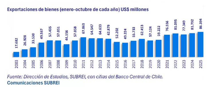 Al referirse a estos resultados, la subsecretaria de la Subrei, Claudia Sanhueza, subrayó que, pese al contexto internacional desafiante, marcado por tensiones comerciales entre potencias globales, Chile continúa diversificando su base exportadora, fortaleciendo no solo la minería, sino también los rubros alimentarios, frutícolas, industriales y de servicios.